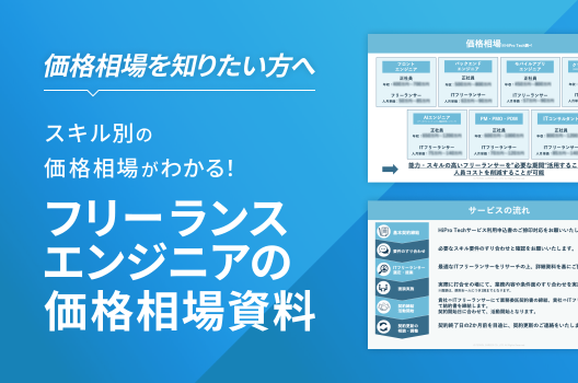 本資料では、正社員エンジニアの年収とフリーランサーの人月単価の価格相場や、HiPro Techの料金形態、サービス利用の流れをご紹介しています。